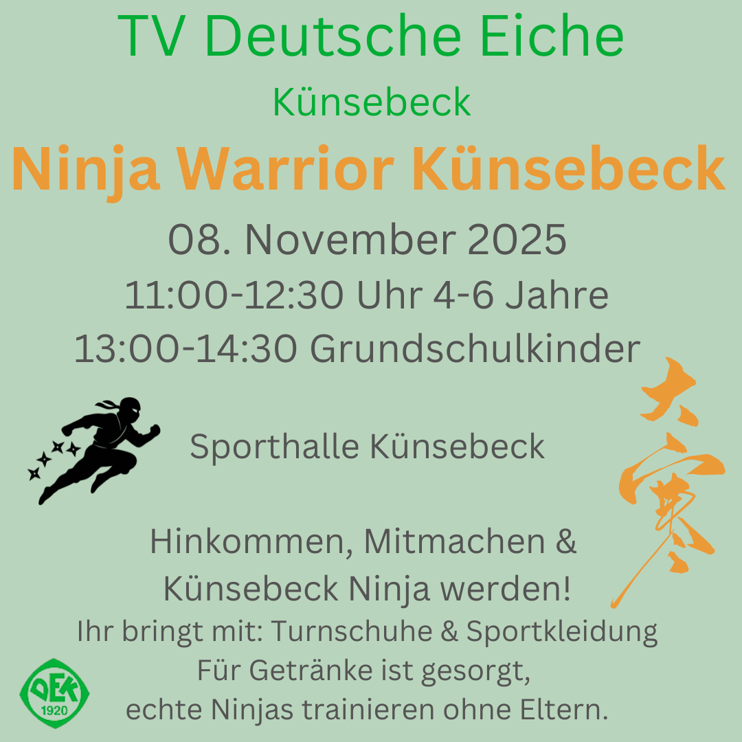 Am Samstag, den 8. November, verwandelt sich die Sporthalle der Grundschule Künsebeck in eine echte Ninja-Arena! Der TV Deutsche Eiche Künsebeck lädt alle sportbegeisterten Kinder zum Ninja-Training ein.